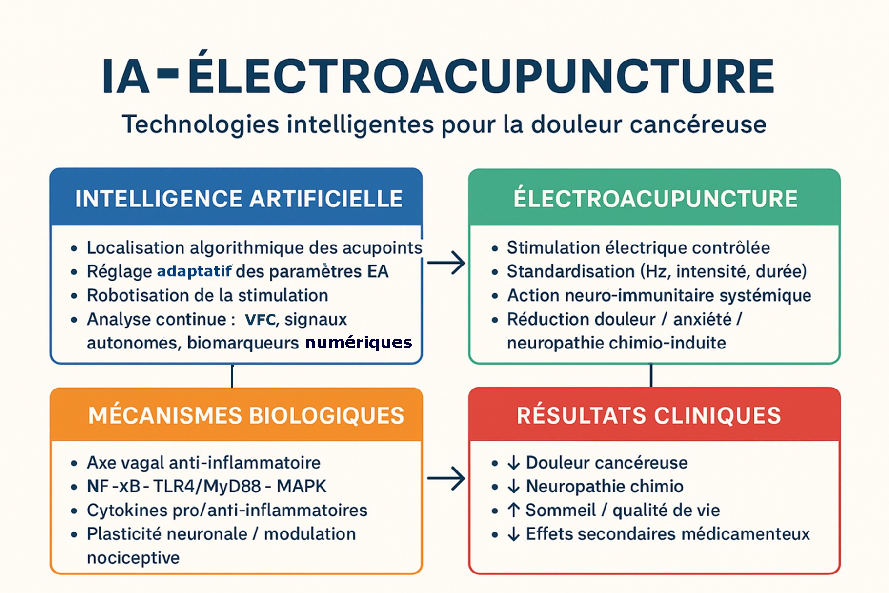 Points essentiels · Modernisation et objectivation de l’EA : L’IA transforme l’électroacupuncture, en rendant ses pratiques plus objectives, mesurables et standardisées, ce qui facilite leur intégration dans la médecine conventionnelle. · Diversité des méthodologies : Une variété de méthodes innovantes est présentée : analyse bibliométrique, extraction de données cliniques par IA, utilisation de capteurs et de vision par ordinateur, et analyse automatique des signaux biologiques (EEG, EMG). · Standardisation et personnalisation des traitements : L’IA permet de standardiser les paramètres de l’EA, d’améliorer la reproductibilité, de prédire l’efficacité clinique et de personnaliser les protocoles selon les besoins du patient. · Objectivation des effets physiologiques : L’IA révèle les mécanismes d’action de l’EA, notamment via des voies neuro-immunes, et quantifie les effets grâce à des biomarqueurs numériques. · Applications cliniques multiples : L’IA a été utilisée dans des essais cliniques pour la récupération post-chirurgicale, la douleur oncologique, la maladie de Parkinson et la paralysie faciale. · Robotisation et automatisation : L’IA permet la création de systèmes autonomes et la robotisation de l’acupuncture, réduisant la variabilité inter-opérateurs. · Analyse bibliométrique avancée : L’IA cartographie les tendances de la recherche mondiale et identifie les axes émergents. · Renforcement institutionnel : L’IA contribue à la reconnaissance institutionnelle de l’EA et des techniques associées. · Vision intégrative et prospective : On insiste sur le rôle de l’IA comme levier pour une médecine chinoise plus scientifique, précise et crédible, ouvrant la voie à des protocoles adaptatifs et monitorés à distance, sans remplacer l’expertise clinique humaine. · Identification des limites et des défis : Il faudra néanmoins tenir compte des obstacles actuels présents qui sont : hétérogénéité des données, manque de protocoles validés, et nécessité de validations multicentriques, ce qui montre une approche critique et réaliste. Mais on comprendra que l’importance dorénavant de l’apport de l’IA à l’électroacupuncture et à la médecine traditionnelle chinoise, tant sur le plan méthodologique que clinique.