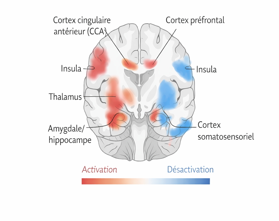 Figure 1. Schéma original de la neuromodulation cérébrale induite par l’acupuncture. Représentant une coupe coronale simplifiée du cerveau humain. Les zones en rouge–orange indiquent une activation fonctionnelle au niveau de l’insula, du thalamus, de l’amygdale, de l’hippocampe et du cortex cingulaire antérieur, régions impliquées dans la modulation de la douleur, l’intégration émotionnelle et les réponses nociceptives. La zone en bleu correspond à une désactivation du cortex somatosensoriel. L’échelle de couleur à droite illustre le gradient d’activation (orange) à désactivation (bleu). Cette figure illustre de manière synthétique les mécanismes centraux de neuromodulation décrits dans la littérature contemporaine sur l’acupuncture. Cette figure synthétise les mécanismes centraux de neuromodulation décrits dans la littérature contemporaine. Illustration originale de l’auteur, inspirée des études en IRMf de Hui et al.