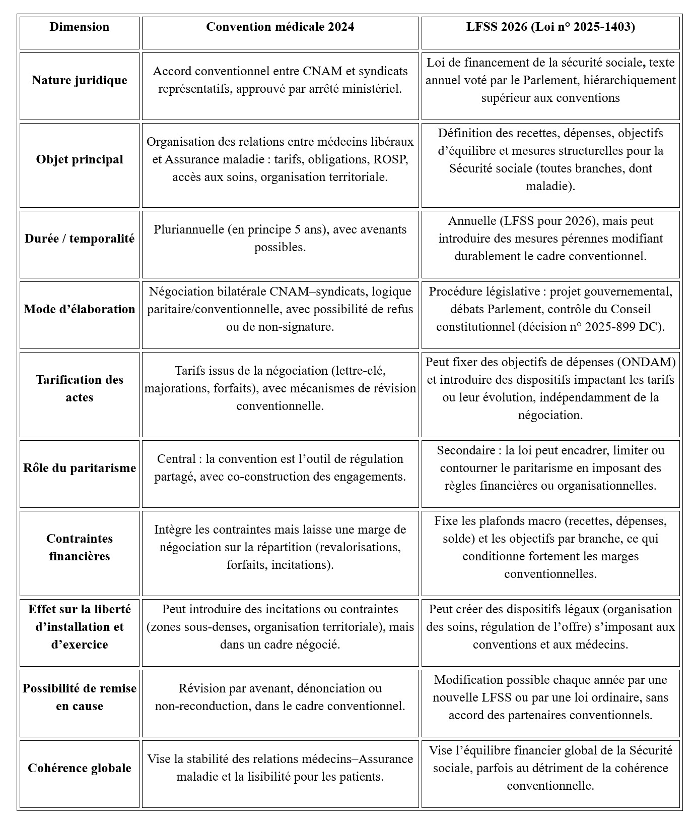 Tableau I. Tableau comparatif entre convention 2024 et LFSS 2026 [[6],[7]].