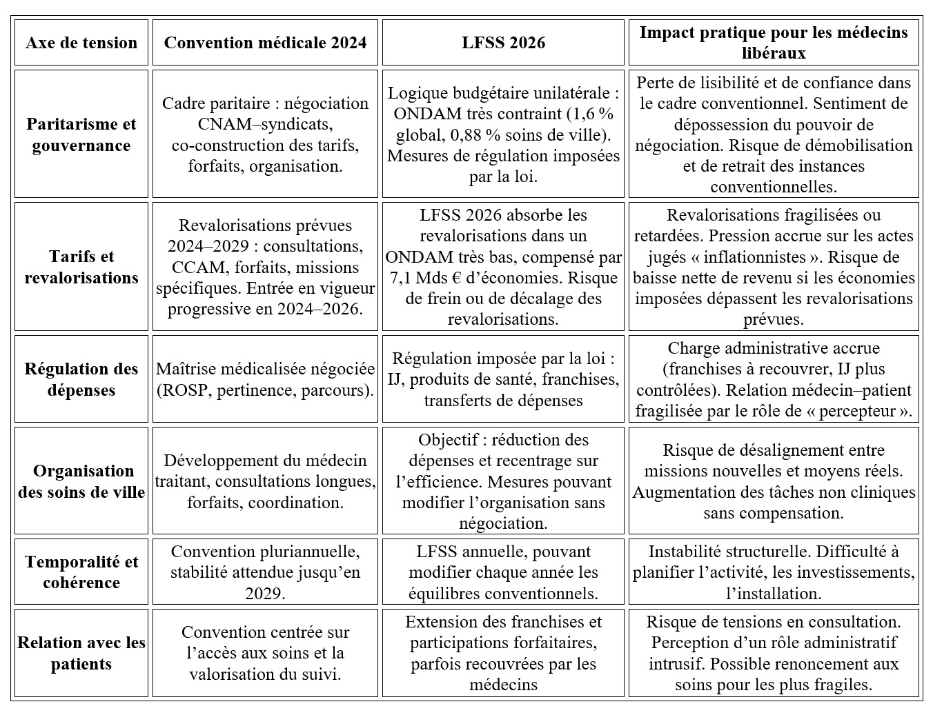 Il existe de ce fait des points de tension majeurs (paritarisme, tarifs, organisation des soins) entre la Convention médicale 2024 et la LFSS 2026 pour les médecins libéraux (tableau II). Cela concerne les données factuelles sur l’ONDAM, les mesures de régulation et les baisses/ajustements tarifaires [[8]].