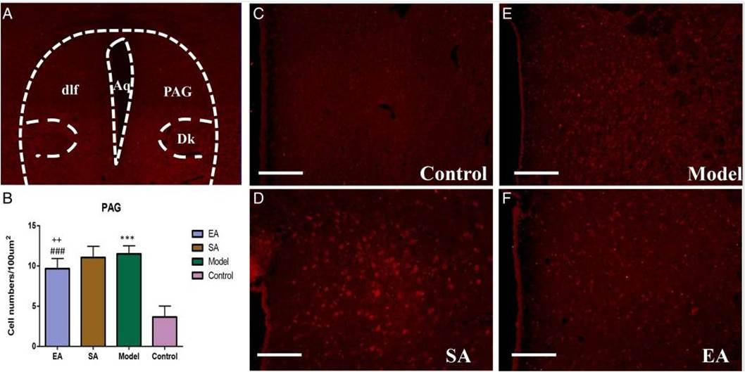 Figure 1. Distribution immunocytochimique des cellules positives au c-Fos dans la région grise périaqueducale (PAG) (A) et nombre de cellules positives pour 100 μm² (B) chez 40 rats qui ont subi une implantation d’électrodes suivie d’aucune stimulation (groupe contrôle témoin, n=10) ou stimulation électrique répétée durale (n=30) sans traitement (groupe modèle, n=10), prétraitement par électroacupuncture (groupe EA, n=10) ou un prétraitement d’acupuncture fictif (groupe SA, n=10). Des images représentatives montrent un marquage c-Fos relativement clairsemé dans le groupe témoin (C) et un groupe EA (F) et un marquage c-Fos relativement intense dans le groupe SA (D) et le groupe modèle (E). Barre d’échelle = 200 μm. Les données sont présentées en moyenne ± écart-type. *** p <0,001 vs groupe témoin. ### p <0,001 vs groupe de modèles. ++ p<0,01 par rapport au groupe SA. Aq, aqueduc (Sylvius); Dk: noyau de Darkschewitsch ; dlf, fascicule longitudinal dorsal (Graphique issu de [15], distributed in accordance with the Creative Commons Attribution Non Commercial (CC BY-NC 4.0) license.