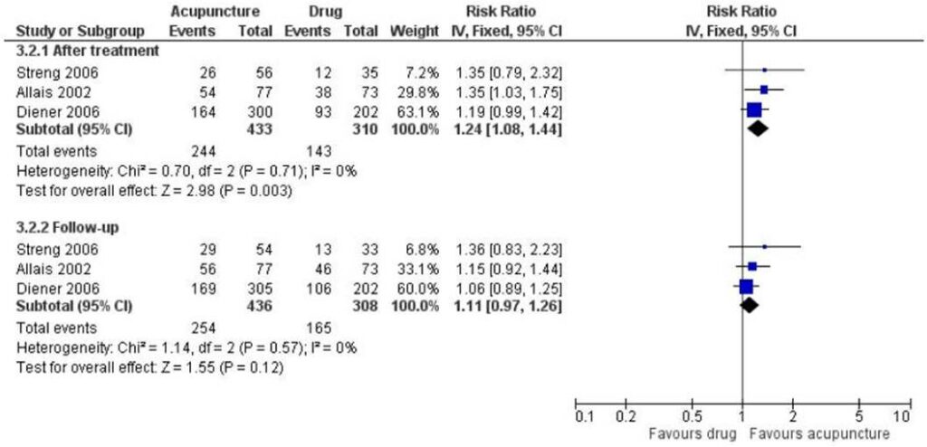 Figure 2. 3.2.1 pour au moins 50% de fréquence de réduction des migraines, l’acupuncture est statistiquement plus efficace (p=0,003) versus traitement de fond après 3 mois de traitement ; 3.2.2 : pas d’efficacité significative (p=0,12) à 6 mois [21].