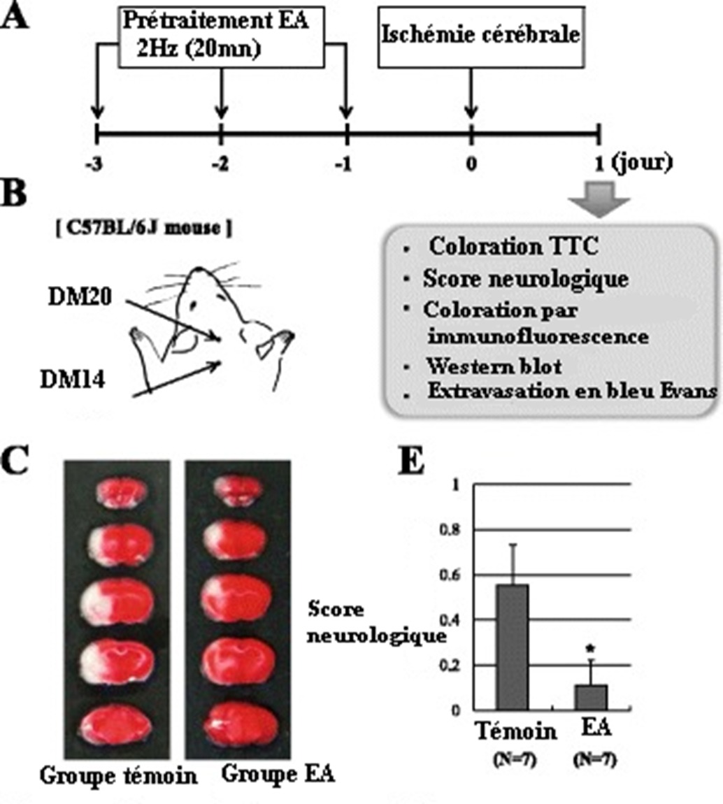 Figure 1. Le prétraitement de l’EA a réduit la taille de l’infarctus et amélioré les fonctions motrices et neurologiques après une ischémie cérébrale focale. A. Schéma illustrant les événements chronologiques des expériences. Les souris ont reçu un prétraitement EA de 20 minutes une fois par jour pendant trois jours avant l’événement ischémique ; ensuite une ischémie cérébrale focale a été induite par une occlusion de l’artère cérébrale moyenne. B. Schéma des points d’acupuncture utilisés dans l’étude. C. Photographies représentatives de coupes cérébrales coronales colorées avec du chlorure de 2,3,5-triphényltétrazolium (TTC) chez des souris témoins et prétraitées par EA. La région blanche indique la zone d’infarctus. E. quantification du déficit neurologique évalué à l’aveugle 24 h après occlusion artère cérébrale. Les données sont exprimées sous forme de moyenne ± SEM (N =7). * p <0,05 par rapport au groupe témoin [49].
