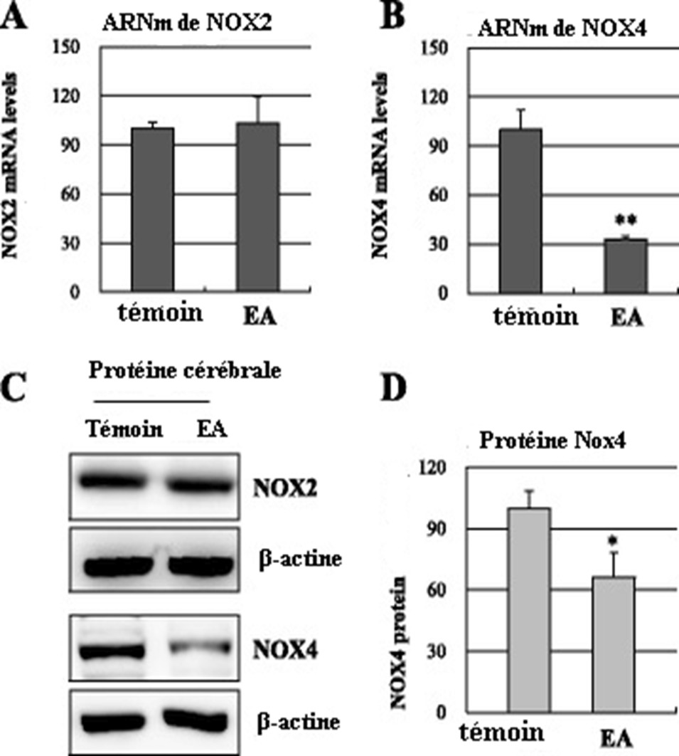 Figure 2. Le prétraitement par EA a diminué l’expression de NOX4, et non de NOX2, après une ischémie cérébrale focale. A, B. PCR en temps réel montre les taux d’ARNm de NOX2 et NOX4 dans les tissus du cerveau ischémique 24 h après une ischémie cérébrale focale. (n=4, ** p <0,01 par rapport au groupe témoin dans son milieu). C. Western blots de NOX2 et NOX4 dans le cortex ischémique 24 h après une ischémie cérébrale focale. La β-actine a été utilisée comme contrôle interne. D. Graphique de quantification densitométrique des bandes de transfert de Western de NOX4. Les données sont exprimées sous forme de moyenne ± SEM (n=4). * p <0,05 par rapport au groupe témoin dans son milieu [49].