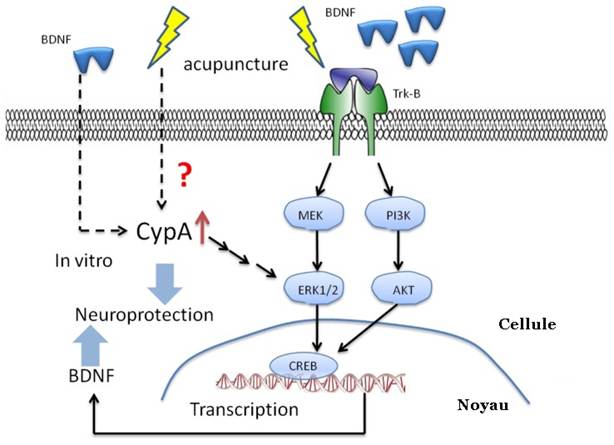 Lors de la migraine, on sait que la stimulation des terminaisons nerveuses du trijumeau autour des vaisseaux sanguins provoque la libération de la substance P, de CGRP et autres substances vasculaires actives entraînant sensibilisation centrale et forte vasodilatation, d’où la douleur. La myosine kinase à chaîne légère (MLCK) et la protéine kinase C sont tous deux impliquées dans ce processus de vasodilatation et vasoconstriction. Zhou et coll. ont donc étudié l’effet de l’action de l’acupuncture au point fengchi (20VB) sur l’activation de la MLCK dans l’artère méningée moyenne des rats modélisés pour la migraine. Quarante-quatre rats Sprague-Dawley (SD) femelles en bonne santé ont été répartis au hasard en quatre groupes : le groupe normal témoin, le groupe témoin modélisé (GTM) mais sans traitement, le groupe d’acupuncture fengchi 20VB (après modélisation de la migraine : le fengchi 20VB est puncturé avec recherche du deqi pendant 2mn et maintenu en place pendant 20mn) et le groupe de prévention fengchi 20VB (on puncture d’abord le baihui 20VG avec recherche du deqi pendant 2mn, aiguille laissée en place 20mn puis on déclenche la crise sur ce modèle de migraine par une stimulation électrique). Comparée au groupe normal témoin, l’activation de la MLCK était significativement diminuée dans le groupe GTM (p<0,01), ce qui indique que les migraines aiguës pourraient être associées à une diminution de MLCK en rapport avec le système de signalisation CGRP. Et à la suite de l’action de l’acupuncture autant en prévention qu’en curatif, la MLCK dans l’artère méningée moyenne est statistiquement augmentée (p<0,05), ce qui pourrait indiquer son efficacité dans la prévention et le soulagement des crises de migraine [[16]].