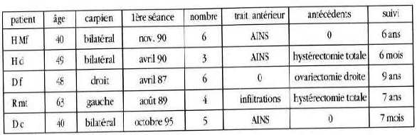 Mme MS est revue dix jours après. Elle a souffert d’une céphalée latente pendant les deux à trois jours qui ont suivi la séance, puis disparition des migraines. Le même traitement est appliqué mais allégé par la suppression des points taichong 3F, hegu 4GI, baihui 20V, sanyinjiao 6Rt et yinlingquan 9Rt droit remplacé par le yinbai 1Rt droit (point saisonnier en été). Elle est à nouveau revue fin août, lors de la 5e saison. Le pyrosis a nettement diminué et elle n’a eu que deux migraines. La piqûre miu est continuée avec le jiexi 41E et dadu 2Rt points de tonification saisonniers du couple des jingbie atteints à droite stimulé par EA à 2Hz.