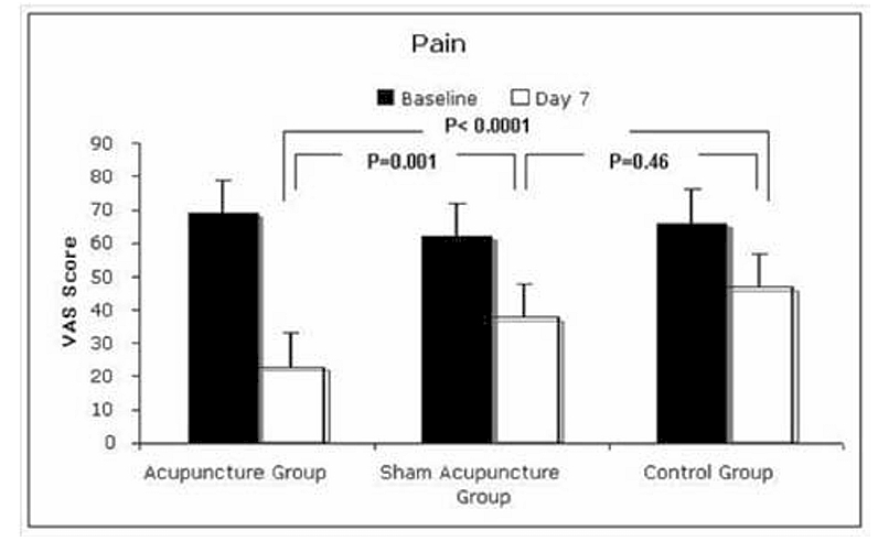 Figure 1. Amélioration de la douleur (évaluation par échelle visuelle analogique) au 7e jour de traitement versus groupe témoin et groupe auriculothérapie simulée [8].
