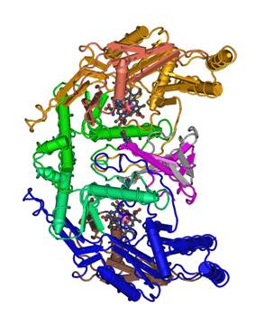En 2006, on objectivait sur un modèle de hamster hypertendu que l’électroacupuncture (EA) au point ES36 (30mn par jour pendant cinq jours) réduisait l’hypertension artérielle par activation des mécanismes de la réaction de biosynthèse du monoxyde d’azote (NO) sous dépendance des NO synthases. Il était montré que l’EA augmentait la concentration périartériolaire de NO. Chez le hamster, l’HTA réduit l’oxyde nitrique synthase endothéliale (eNOS3) et l’oxyde nitrique synthase neuronale (nNOS1), réduction inhibée donc par l’EA au 36E [1]. Sur cette image, vous pouvez justement observer la structure de l’oxyde nitrique synthase endothéliale (NOS3) humaine avec un substrat d’arginine.