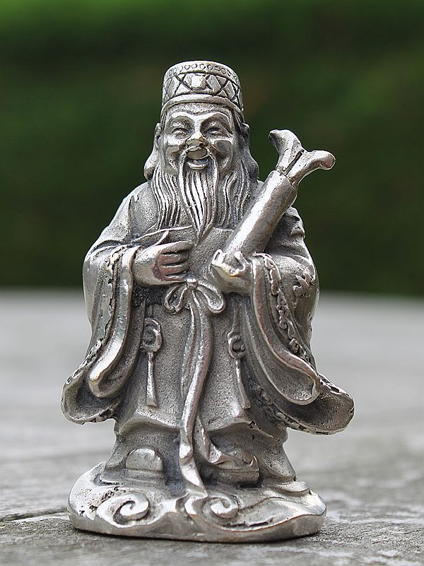 Un des courants de pensée à la base de l’élaboration de la Médecine Traditionnelle Chinoise est celui de l’école confucéenne, avec en particulier l’un des cinq Classiques, le Yijing encore appelé Zhouyi (周易). Bien qu’on le fasse remonter à l’invention des trigrammes par Fuxi, la tradition chinoise considère que, comme les autres Classiques, il aurait été compilé par Confucius lui-même (551-479 AEC) auquel on attribue le commentaire Shiyi(十翼) (dix ailes), aussi appelé Yizhuan (易傳) (« commentaire du Yijing ») sous le règne de Han Wudi (140-188). Cette statuette en argent le représente avec une longue moustache et une épaisse barbe dans la tenue traditionnelle d’un fonctionnaire de haut rang portant vêtements et coiffure officiels, référence à son bref passage en tant que ministre de la justice dans son état natal de Lu. Il fut figuré à travers les siècles de façons très variées, reflétant à la fois les fluctuations de sa position sociale dans la vie et les honneurs posthumes qui lui ont été attribués. Vous trouverez de plus amples explications sur les différents courants à l’origine de la MTC dans la mise au point sur les Textes Classiques de ce numéro.