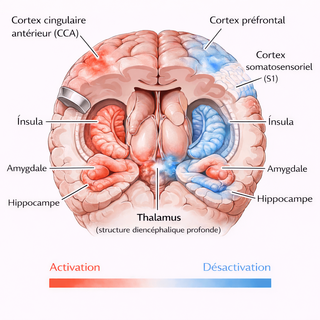 Figure 1. Schéma original de la neuromodulation cérébrale induite par l’acupuncture, représentant une coupe coronale profonde au niveau médial simplifiée du cerveau du cerveau humain. Les zones en rouge–orange indiquent une activation fonctionnelle au niveau de l’insula, du thalamus, de l’amygdale, de l’hippocampe et du cortex cingulaire antérieur, régions impliquées dans la modulation de la douleur, l’intégration émotionnelle et les réponses nociceptives. La zone en bleu correspond à une désactivation du cortex somatosensoriel. L’échelle de couleur à droite illustre le gradient d’activation (orange) à désactivation (bleu). Cette figure illustre de manière synthétique les mécanismes centraux de neuromodulation décrits dans la littérature contemporaine sur l’acupuncture. Cette figure synthétise les mécanismes centraux de neuromodulation décrits dans la littérature contemporaine. Illustration originale de l’auteur, inspirée des études en IRMf de Hui et al.