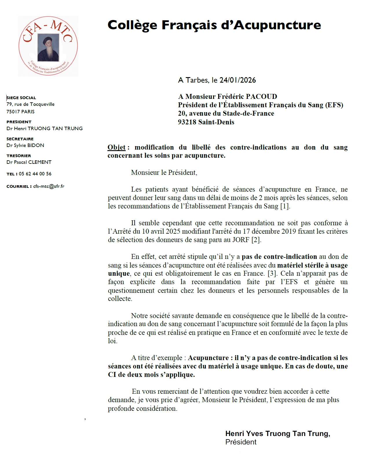 À la suite d'une intervention directe du Dr Truong Tan Trung le 24 janvier 2026, le Président de l’Établissement Français du Sang (EFS), M. Frédéric Pacoud, a confirmé le 9 février dernier que leurs supports d'information ont été rectifiés. Le libellé est désormais conforme à la loi : il n'y a pas de contre-indication pour l'acupuncture pratiquée avec du matériel stérile à usage unique, comme c’est le cas en France depuis plus de 20 ans.