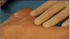 Démonstration d’une acupuncture "sèche" d’un trigger point dans le traitement d’une fasciite plantaire (talalgie).