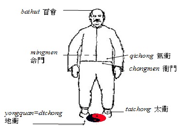 L’homme est fils du Ciel-Terre, il est leur médiateur par excellence. Il est l’Empereur, Wang 王 : sur la Terre qui porte, et sous le Ciel qui le couvre, l'Homme est celui qui reçoit et donne. L'Empereur est en position de non agir wuwei 無為 : « C’est se conformer au Dao ». C'est la raison pour laquelle en taijiquan les pieds doivent être en contact avec le sol comme des ventouses de gecko, à la fois adhérentes et mobiles. Le sommet du crâne est érigé vers le haut au milieu « cela s'installera » et la verticalité de l'être se mettra en place (photo 9 et 11a).